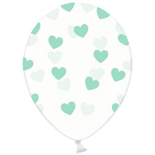 Latexový transparentní balónek s celoplošným potiskem tyrkysových srdíček vhodné pro nafukování vzduchem i heliem Velikost: 30cm Balení : 6 ks